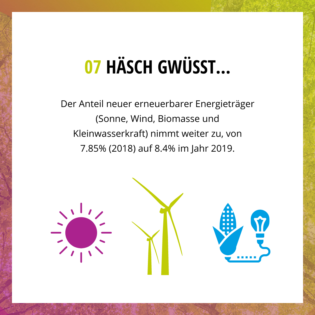 Der Anteil neuer erneuerbarer Energieträger (Sonne, Wind, Biomasse und Kleinwasserkraft) nimmt weiter zu, von 7.85% (2018) auf 8.4% im Jahr 2019. Davon wurden rund 95% in der Schweiz produziert und gut drei Viertel durch das Einspeisevergütungssystem (ESV) gefördert. Um den CO2 freien Strommix auch aus dem endgültigen Ausstieg aus der Atomkraft sicher zu stellen, braucht es massive Anstrengungen in der Produktion als auch in der Steigerung der Energieeffizienz.
